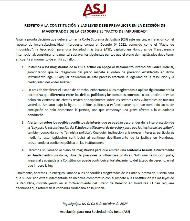 Ante la decisión que deberá tomar la Corte Suprema de Justicia (CSJ) este martes, en relación con el «Pacto de Impunidad», les compartimos pronunciamiento de la Asociación para una Sociedad más Justa (ASJ)